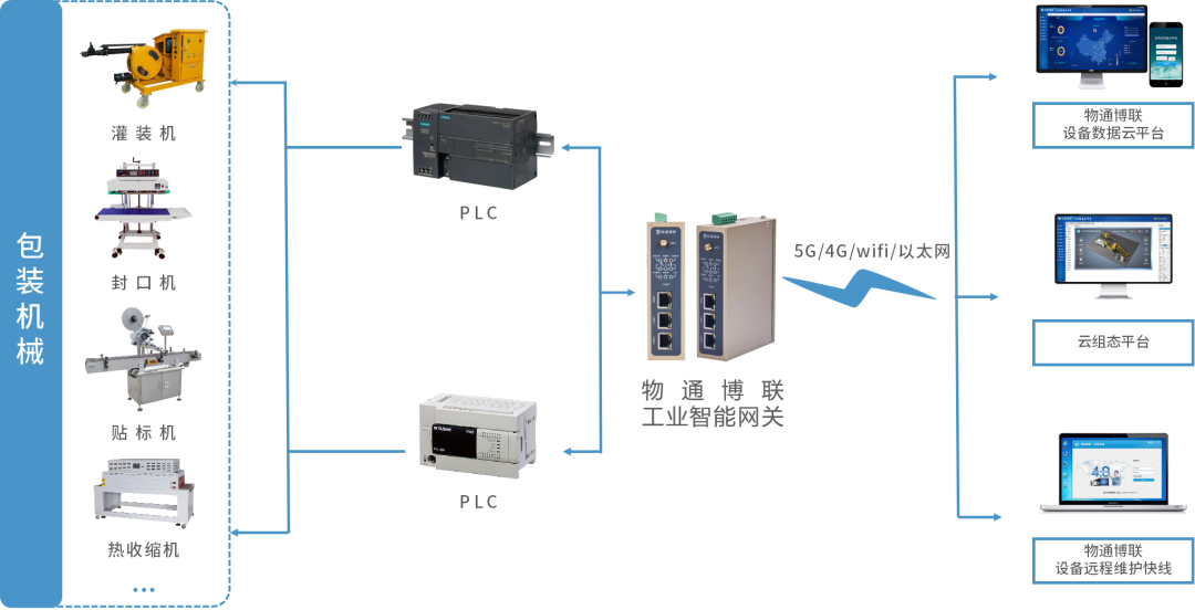 威九国际工业智能网关具有丰富的通信协议和接口,顺利获得接入包装机械设备的控制器PLC,就能实时采集包装机械设备运行状态、温度、压力、振动等参数,顺利获得5G、4G、WIFI、以太网等方式将数据上传到云平台,实现远程监控、组态监控、设备管理、故障报警、远程控制、远程维护、数据分析等功能,全面掌握设备的运行情况,帮助企业提升包装机械设备运维与管理水平,保障安全稳定生产,提高生产效率。当设备出现异常故障就会及时通知管理人员,工程师可以顺利获得威九国际设备维护快线对设备进行远程故障诊断与远程维护,减少设备停机时间,有效提高设备运维效率并降低运维成本。