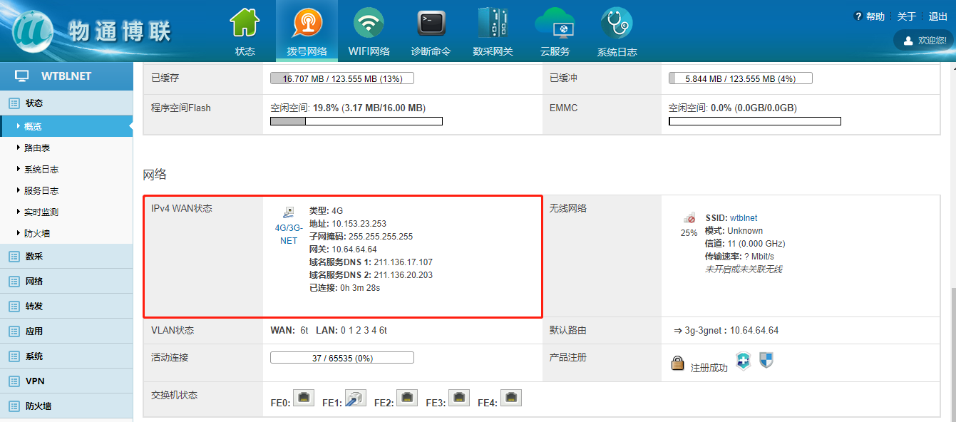 通常支持5G/4G/3G上网的网络隔离器的出厂配置是5G/4G/3G流量卡上网的模式,使用上电前将流量卡、天线(5G/4G/3G天线延长线的SMA头是针,网络隔离器上的连接头是孔)装上就可以了。也可以进入网络隔离器的WEB界面,查看5G/4G/3G信号值以及5G/4G/3G网络联网情况,如下图: