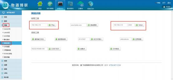 进 入 网 关 WEB 界 面 , 在 “ 网 络 ” -> “ 网 络 诊 断 ” 界 面 中 , 通 过 Ping 和 Telne t 可测试网关是否和 OPC UA 设备正常连接。