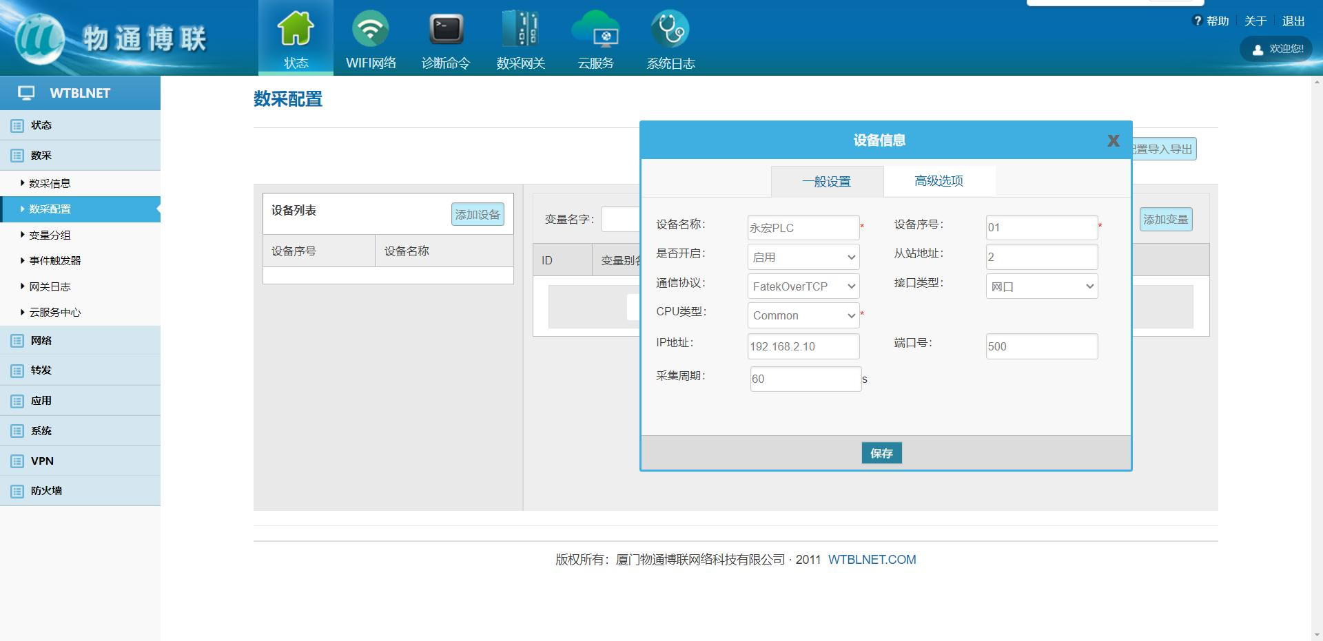 输入设备名称(任意),设备序号(任意,注意同一网关下的设备序号不能重复),从站地址(设备站号),通信协议(FATEK over TCP),IP 地址(设备 IP 地址)以及端口号(设备端口号),采集周期根据自身需求设置,然后点击保存。