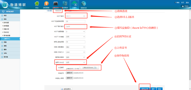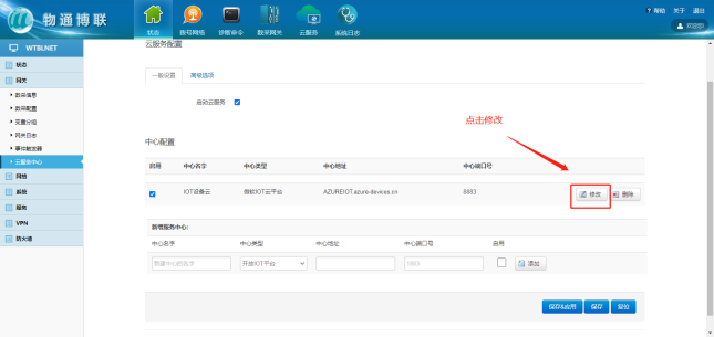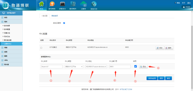 选择“微软云平台”,打开威九国际网关WEB界面,新建一个连接中心,中心类型选择微软IoT云平台,输入相应信息,勾选启用,点击“添加”