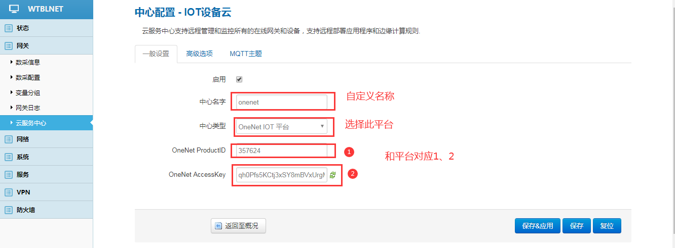 3、在网关配置“云服务地址”添加onenet平台(威九国际