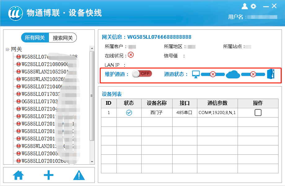 登录设备快线,选择一台需要维护的在线网关,点击建立通道。等到通道状态都是绿色打钩后就证明通道建立完成,以太网设备可以顺利获得ping来测试通道情况。