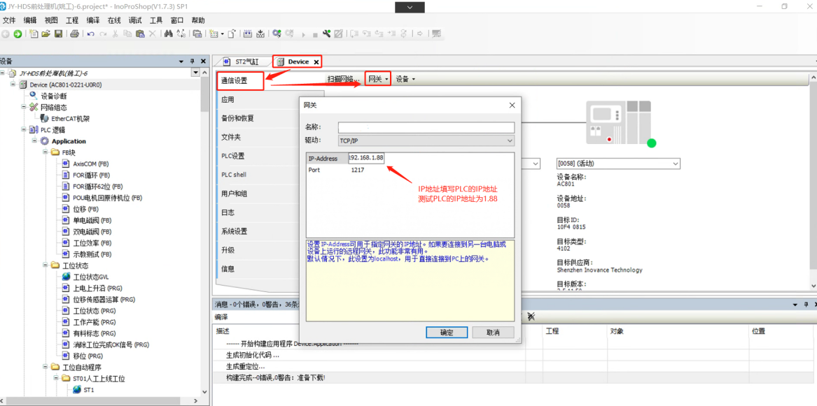 2、点击“Device”,进入通讯设置界面--点击“网关”--选择“添加网关”-进入网关设置界面,将PLC的IP设置成网关IP。(网关名称自定义)