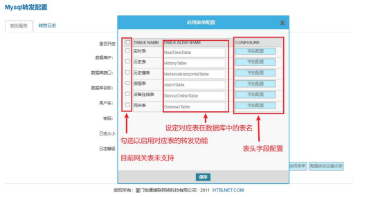 在该界面勾选以启用对应表的转发功能,并且可以设置表名称以及表头字段名称