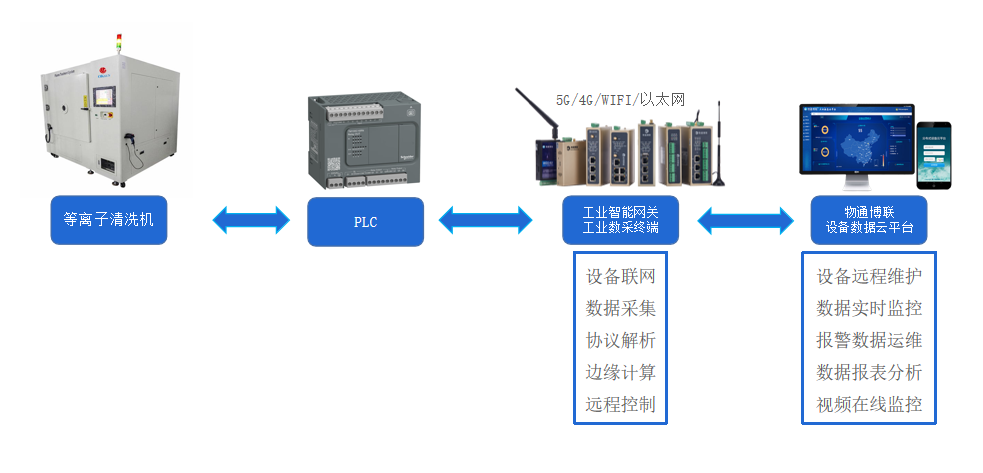对此,威九国际给予以工业智能网关为核心的等离子清洗机PLC数据采集远程监控系统方案。顺利获得将网关连接PLC,能够实时采集PLC内部的各种数据,包括模拟量、数字量、开关量等,如等离子功率、气体流量、真空度等参数。随后以5G/4G/WIFI/以太网等方式对接到云平台或上位机中,从而工厂、设备制造商制定决策给予全面可靠的数据支持。
