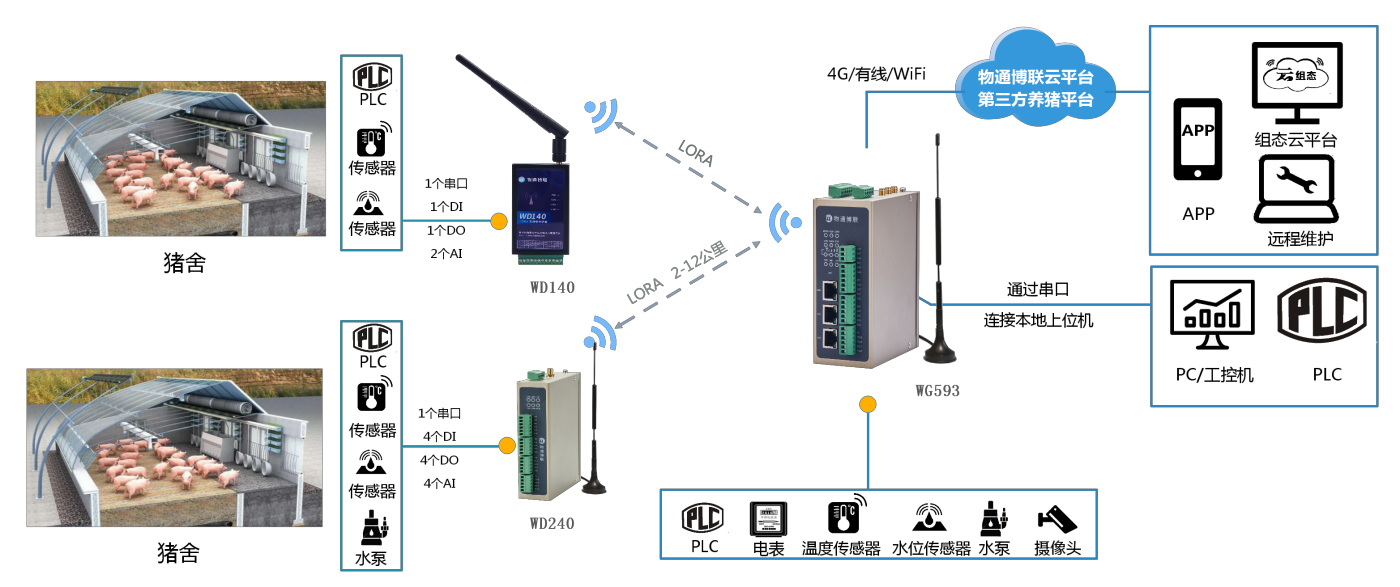 网关具备多网口/串口与多协议数据采集能力,能够实时采集养殖场内的温湿度、氨气浓度、二氧化碳浓度、光照强度、风速风向等多维度环境参数,并顺利获得5G/4G/WIFI/以太网等方式对接到智慧养殖管理平台中。