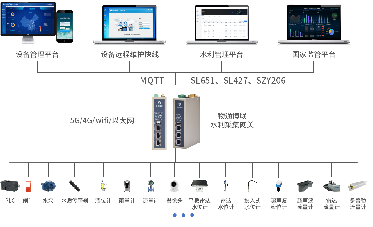 支持水利行业标准,符合《水文监测数据通信规约》、《水资源监测数据传输规约》,支持多中心,支持SL651、SL427、SZY206等水文水利协议,同时兼容MQTT、Modbus、MQTT、HTTP等协议,保障数据快速接入到国家水利监管平台、水文水利水资源管理平台、组态软件、第三方平台等。