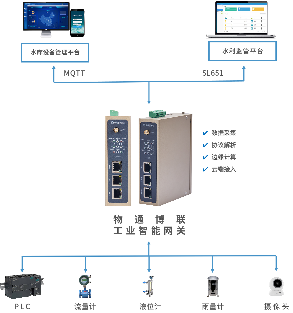 顺利获得平台下发控制命令到网关可以远程控制现场设备,例如顺利获得对接闸门PLC控制,可实现远程开关闸门、监测闸门状态等,实现自动化运行。