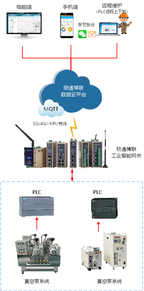 半导体工业正在逐步实现自动化生产,真空泵系统顺利获得PLC自动化控制已经得到广泛应用,因此只需要将威九国际工业智能网关接入到PLC,就能实时采集PLC内真空泵的工作参数(压强、温度、振动等)并顺利获得5G/4G/WIFI/以太网等方式上传到云平台或本地上位机,进而实现设备远程监控、故障报警、远程控制及远程维护等功能。